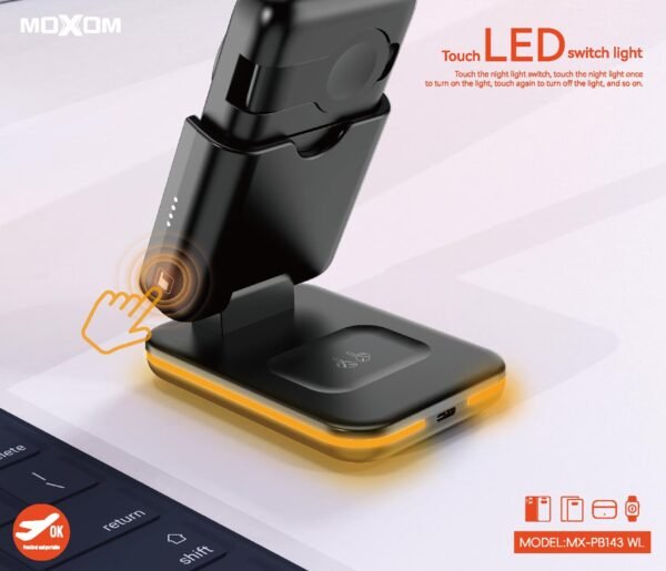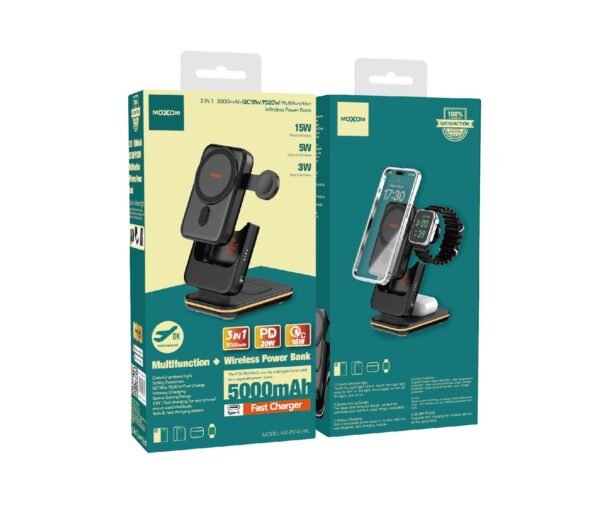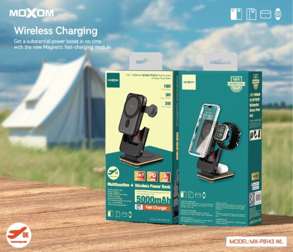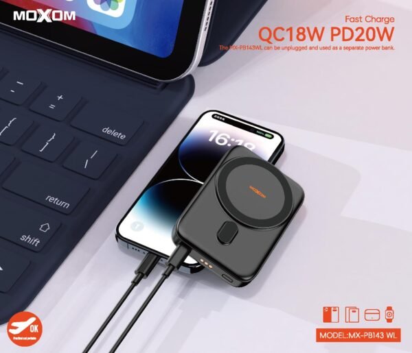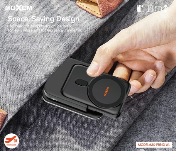 اكتشف قوة الشحن اللاسلكي مع باور بنك موكسوم PB143، المصمم خصيصًا لتلبية احتياجاتك اليومية. يتميز هذا الجهاز بسعة بطارية تصل إلى 5000mAh، مما يضمن لك شحن أجهزتك المحمولة في أي وقت وأي مكان.