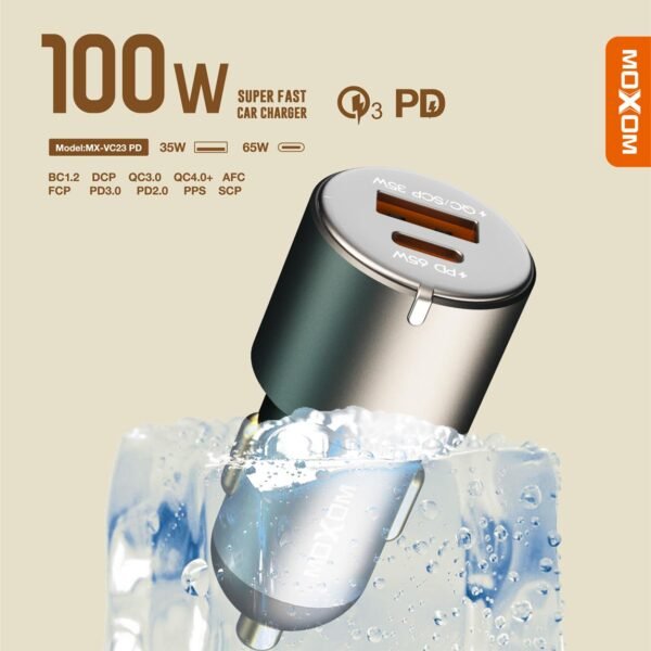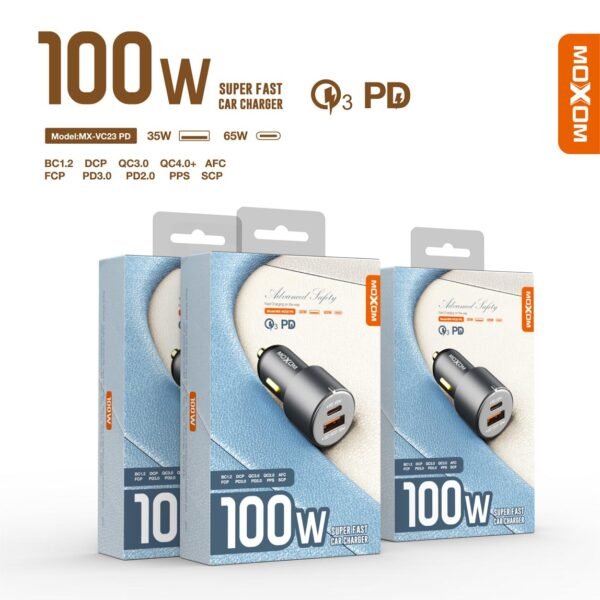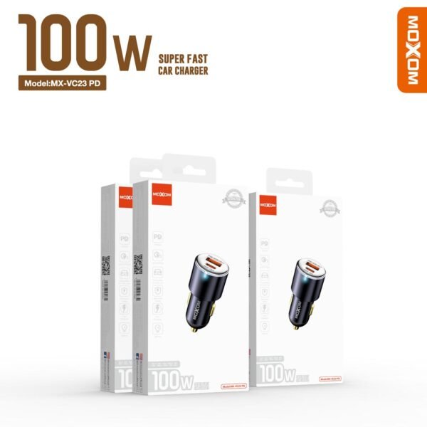 استمتع بشحن سريع وآمن مع شاحن السيارة VC23 PD موكسوم. يأتي هذا الشاحن بقوة 100 وات، مما يجعله الخيار المثالي لتلبية احتياجاتك من الطاقة أثناء السفر.