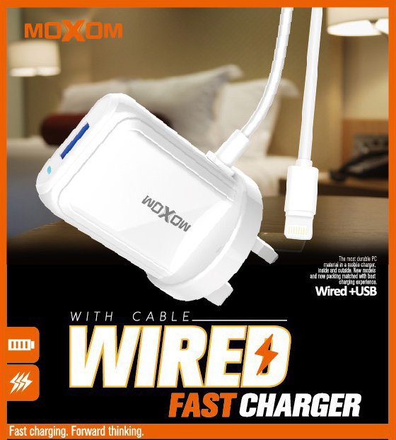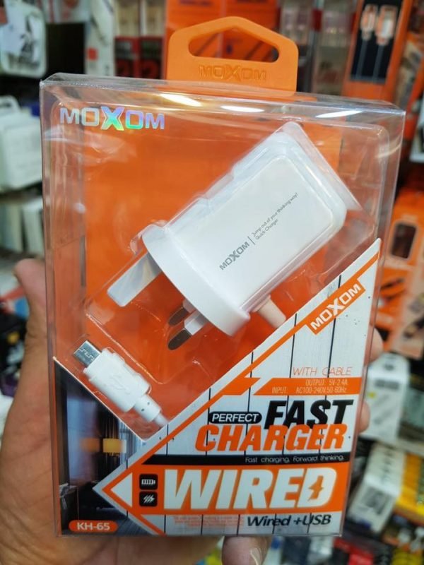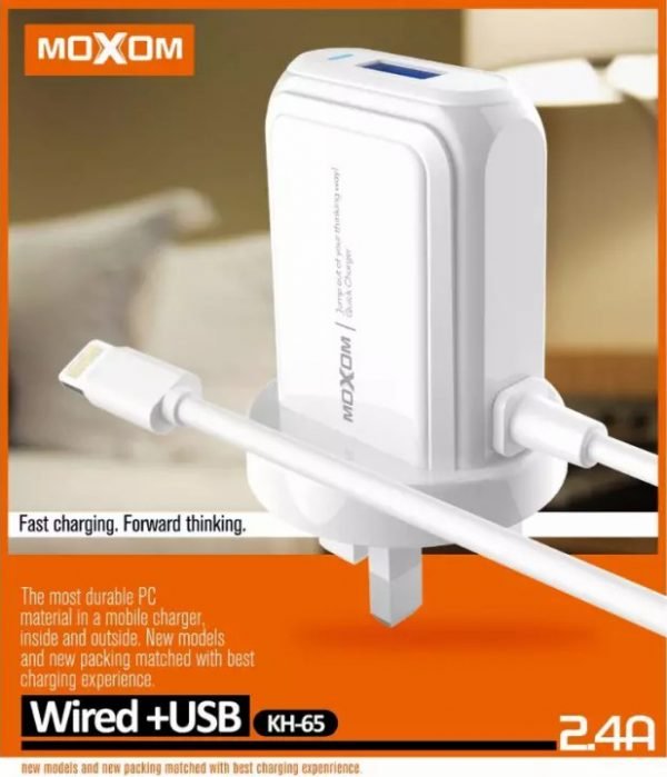 استمتع بشحن سريع وفعال مع شاحن KH-65 من موكسوم. تم تصميم هذا الشاحن ليوفر لك تجربة شحن مريحة وسريعة، حيث يأتي بكابل شحن مدمج ومنفذ USB يدعم شحن سريع بقوة 2.4 أمبير.
