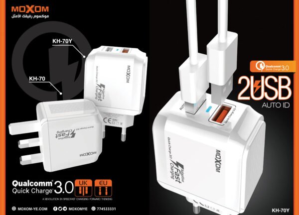 استمتع بتجربة شحن فريدة وسريعة مع شاحن KH-70 من موكسوم، الذي يدعم تقنية Qualcomm Quick Charge 3.0، مما يتيح لك شحن أجهزتك بسرعة تصل إلى 18 واط.