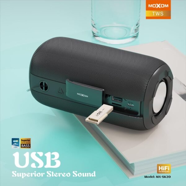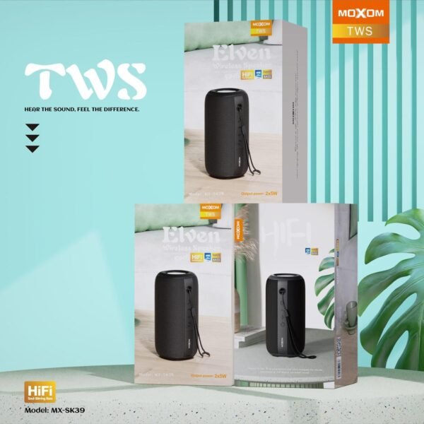 استمتع بصوت فائق الجودة مع مكبر صوت SK39 موكسوم اللاسلكي. يتميز هذا المكبر بتصميمه العصري والمضاد للماء (IPX6)، مما يجعله الخيار المثالي للرحلات والمغامرات في الهواء الطلق.